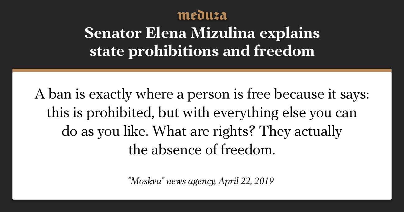 Notoriously conservative Russian Senator Elena Mizulina has offered her latest defense of the federal prohibitions adopted by the State Duma in recent years. Speaking at an Internet security forum, Mizulina argued that freedom is actually restricted by civil rights. The senator then explained that rights “are when you can act, but only according to the way it’s written in the law.” “The more rights you have, the less freedom,” she concluded.