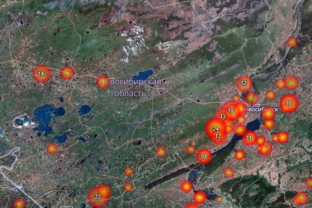 Площадь пожаров Новосибирской области, по данным сайта космического мониторинга на 23−24 апреля, составила более 21 тыс. га. Основная часть возгораний зафиксирована в восточной части региона.