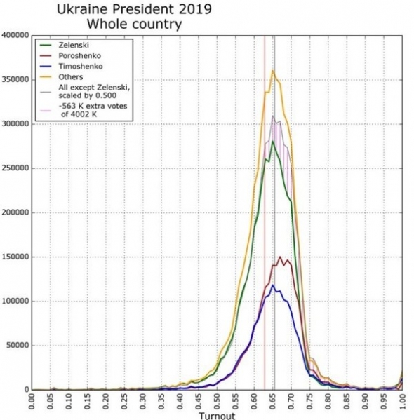 В случае честного подсчета график выглядит симметрично — на участках с высокой, средней и низкой явкой голоса распределяются примерно одинаково. Именно это мы и видим на выборах президента Украины.