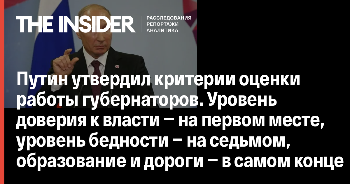 Путин утвердил критерии оценки работы губернаторов. Уровень доверия к власти — на первом месте, уровень бедности — на седьмом, образование и дороги — в самом конце