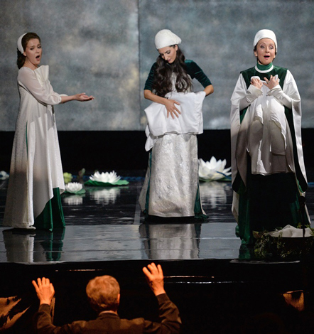 © Юрий Мартьянов / Коммерсантъ Нынешняя постановка, осуществленная в рамках Года музыки Великобритании и России, не привозная, а полностью своя собственная — так что должна пожить на сцене «Новой оперы» подольше «Поворота винта». После «Саломеи», «Фауста» и «Пряничного домика» это уже четвертая работа чудесного местного девичьего тандема — режиссера Екатерины Одеговой и художника Этели Иошпы (с примкнувшим к ним световых дел мастером Тимофеем Ермолиным).