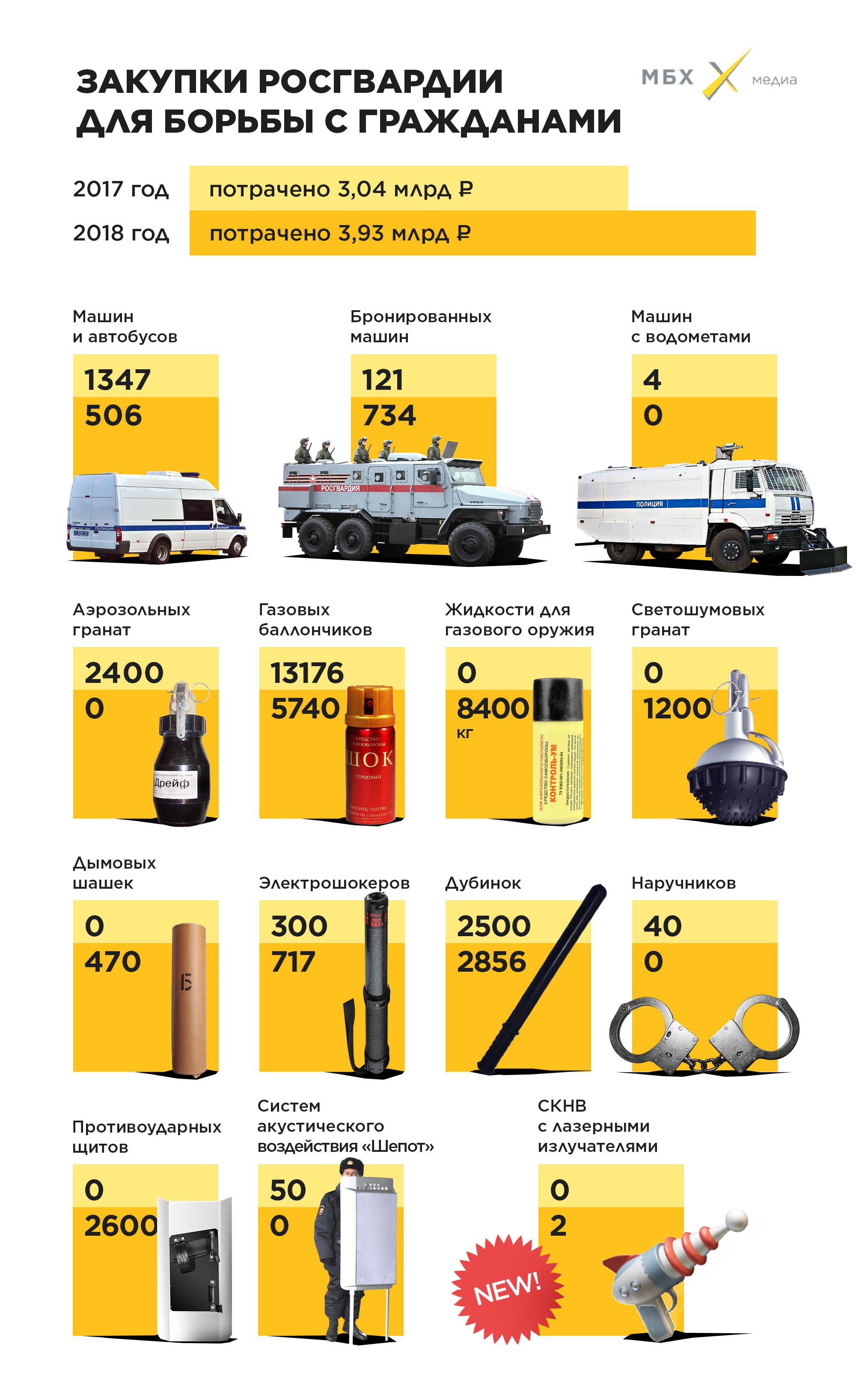 Совсем скоро узнать о приобретении нацгвардией новых электрошокеров для разгона митингов или топлива и продуктов по завышенным ценам будет невозможно — ведомство хочет засекретить информацию о своих госзакупках, и проект соответствующих изменений в законодательство был внесен в конце прошлой недели. «МБХ медиа» составило подборку трат Росгвардии за последний год, которые были взяты из открытых источников. Только в 2018 году для борьбы с гражданами ведомство потратило почти 4 миллиарда рублей.