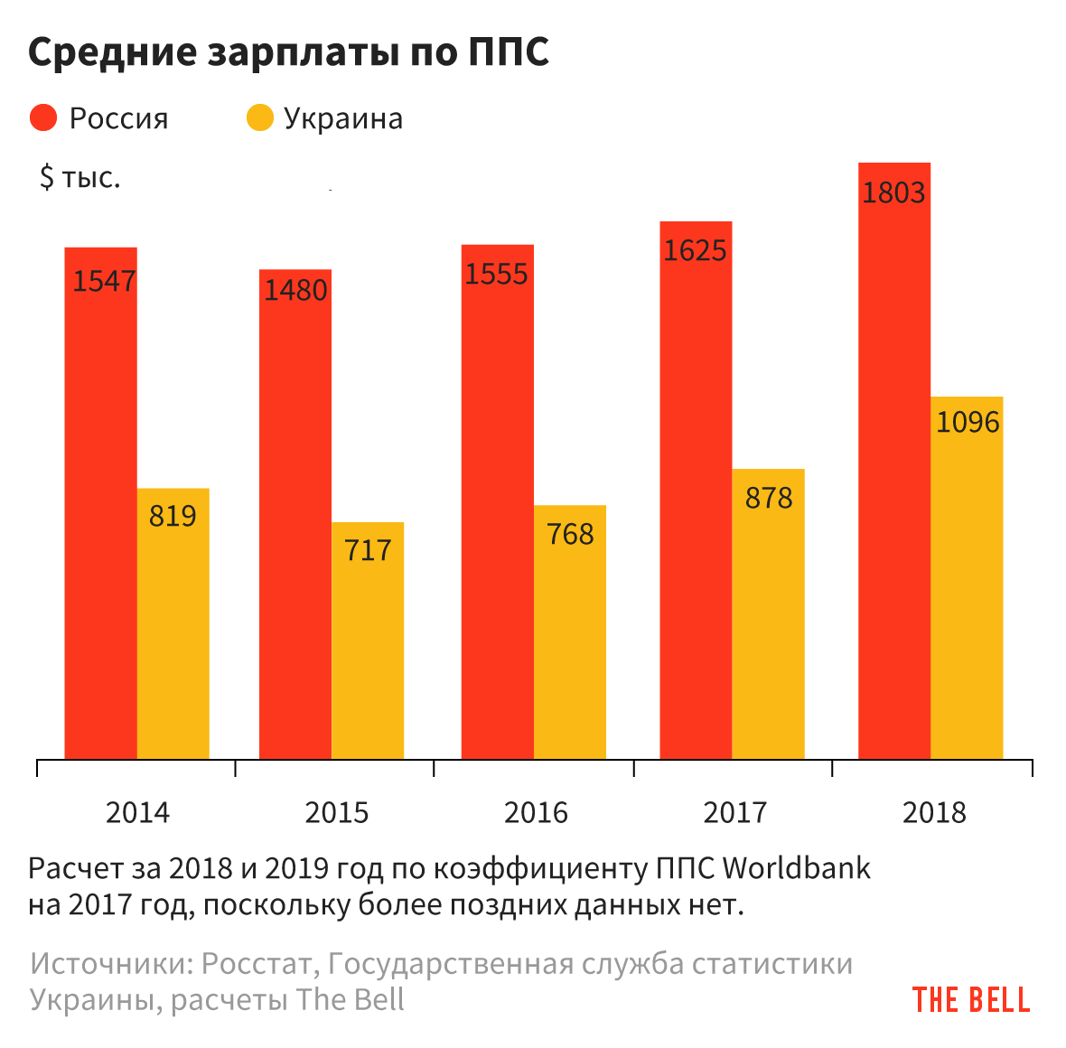 - Реальные доходы населения в двух странах сравнивать трудно из-за разных методик подсчета, но зарплаты на Украине последние два года растут примерно вдвое быстрее. Дело, конечно, и в эффекте низкой базы, но не только — открывшийся для украинцев европейский рынок труда заставляет местных работодателей повышать зарплаты.