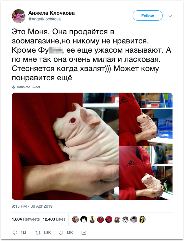 В конце апреля пользовательница твиттера Анжела Клочкова опубликовала у себя на странице фотографии лысой морской свинки по имени Моня. По словам автора, Моня продавалась в тульском зоомагазине, но никто не хотел ее покупать из-за отсутствия шерстки. Люди называли ее «ужасом». Анжела решила найти Моне хозяина в твиттере.