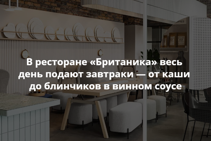 На Петроградской стороне открылся ресторан «Британика», в котором весь день можно заказывать завтраки. Заведение расположено на Малой Посадской улице, 4.