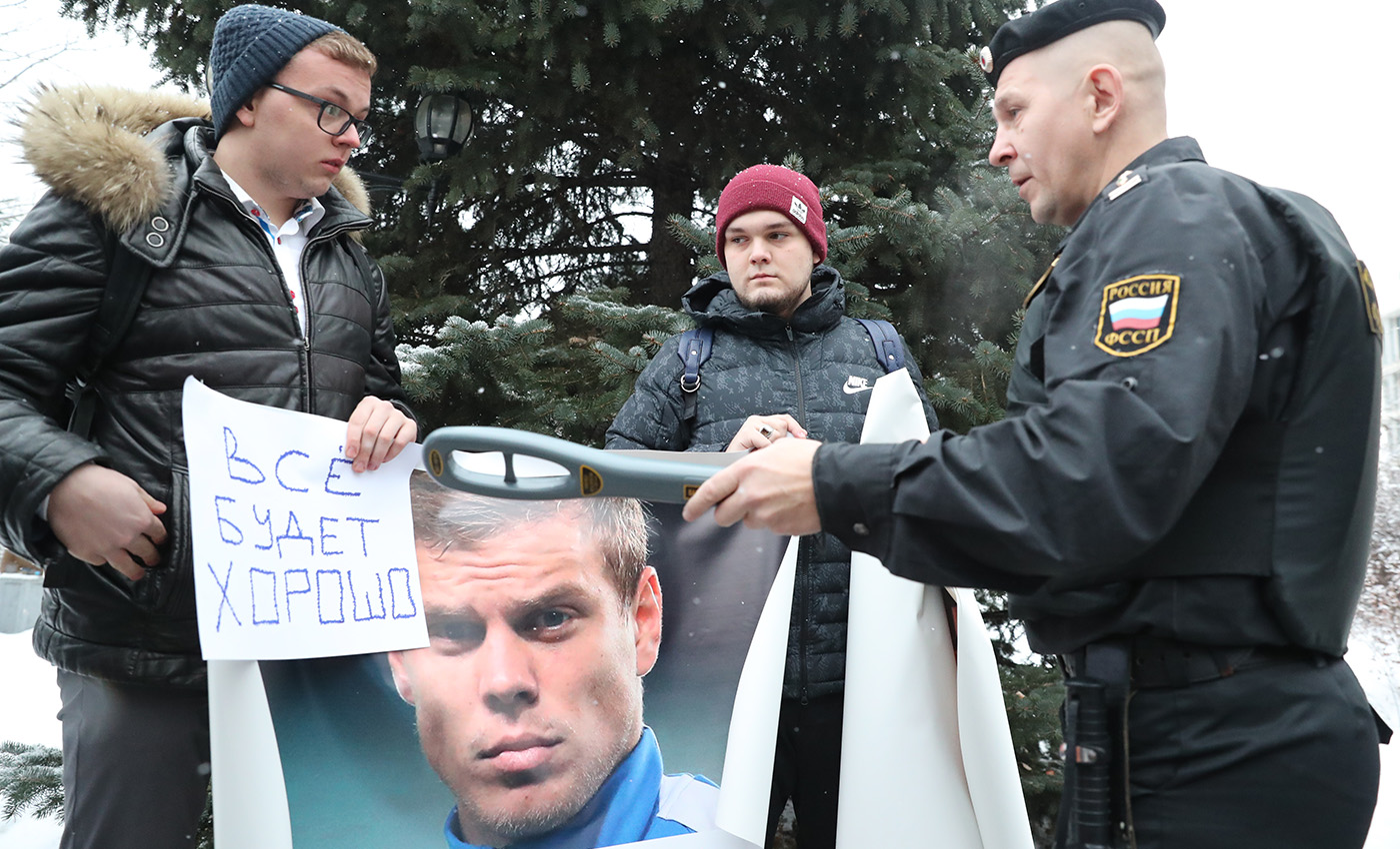 Футбольные болельщики с портретом Александра Кокорина у здания Мосгорсуда. Фото: Антон Новодережкин / ТАСС