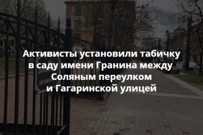 За образец таблички были взяты адресные указатели Петербурга. Сад имени Даниила Гранина находится между Соляным переулком и Гагаринской улицей в Петербурге.