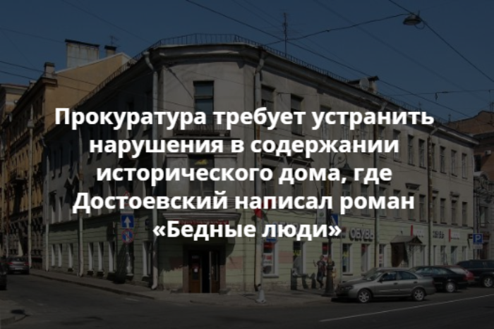 Прокуратура Центрального района Петербурга потребовала устранить нарушения законодательства, обнаруженные в управлении многоквартирным домом в Графском переулке, 10–11. Это здание — объект культурного наследия федерального значения. В нем жили писатели Григорович и Достоевский.