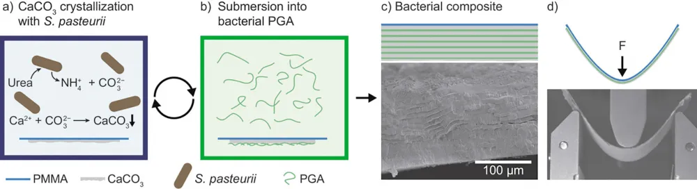 Для получения искусственного перламутра Мейер с коллегами помещали стеклянную или пластиковую пластинку в стакан с бактерией Sporosarcina pasteurii, предоставляя ей источники кальция и мочевины (в организме человека мочевина выводится через почки). В результате обмена веществ бактерии на пластинке начинали образовываться кристаллики карбоната кальция. Для получения полимерного слоя — роль полимера играл полипептид γ-полиглутамат — пластинку с кристалликами карбоната кальция помещали в раствор, в котором находилась другая бактерия — Bacillus licheniformis. В результате работы этой бактерии на поверхности кристаллов карбоната кальция нарастал слой γ-полиглутамата. Затем пластинку снова отправляли к S. pasteurii и т. д. Каждую пару этапов выдерживания пластинки в растворах, содержащих первый и второй организм, повторяли 23 раза.