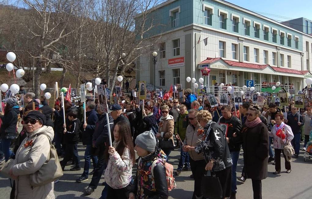 В Южно-Сахалинске после традиционного военного парада по главной улице города прошли 7 тысяч участников "Бессмертного полка". В Магадане шествие жителей с портретами и плакатами с фамилиями погибших родственников называют самым масштабным мероприятием из всех запланированных на День Победы.