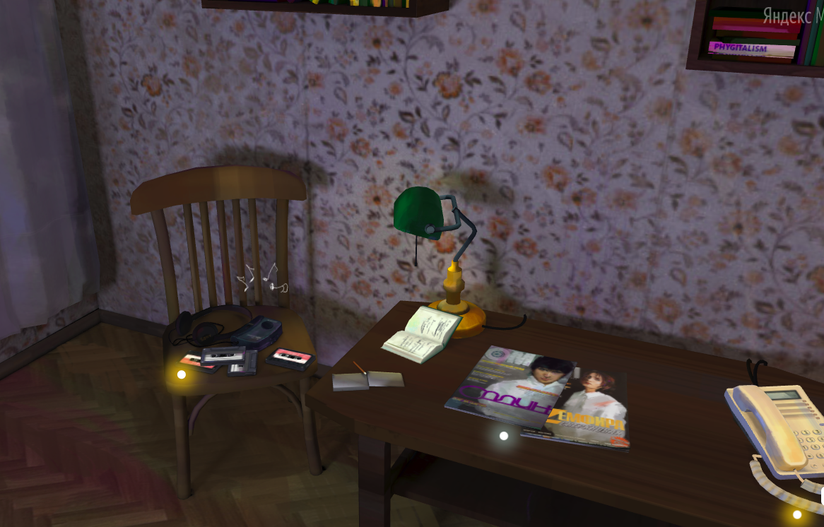 В виртуальной комнате есть несколько отсылок к песням с первой пластинки, при щелчке на подсвеченные предметы появляются строчки из композиций. Если щелкнуть на лампочку на потолке, то откроется весь альбом «Земфира».