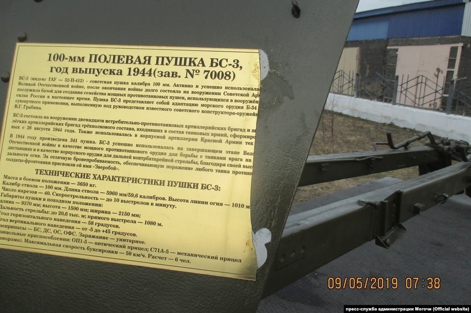 По словам чиновников, полевую пушку БС-3 установили в Могоче 8 мая, в тот же вечер неизвестные её повредили. Вандалы сломали информационную табличку, а потом "приклеили" отломанную часть "на слюни", отломили запчасть, испинали пушку, сообщили городские чиновники.
