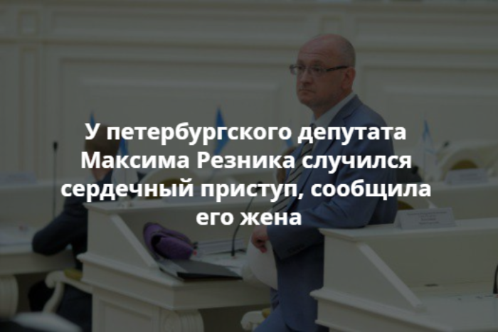 Вечером 11 мая у депутата Законодательного собрания Петербурга Максима Резника случился сердечный приступ. Об этом жена Резника Ксения Казарина сообщила «Медиазоне» и проекту «МБХ медиа Северо-Запад».