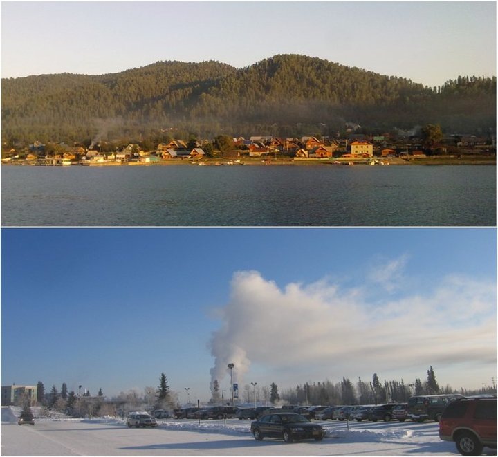 Формирование приземной инверсии с повышенной концентрацией загрязняющих веществ при сильно устойчивых условиях в атмосфере. Вверху — Телецкое озеро, внизу — Аляска, город Фэрбанкс. Источник: Ирина Репина
