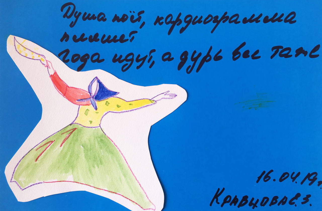 По ее словам, ей интересно рисовать с бабушками и дедушками, а им интересно петь. «Поэтому они учат меня частушкам, а я их — акварели. Мы обсуждаем классическое искусство, задаем вопросы современному. Создаем “Наш ответ Кабакову, Булатову, Пепперштейну”. Приезжаем на выставки в музеи, делаем выставки у них в пансионате», — говорит девушка.