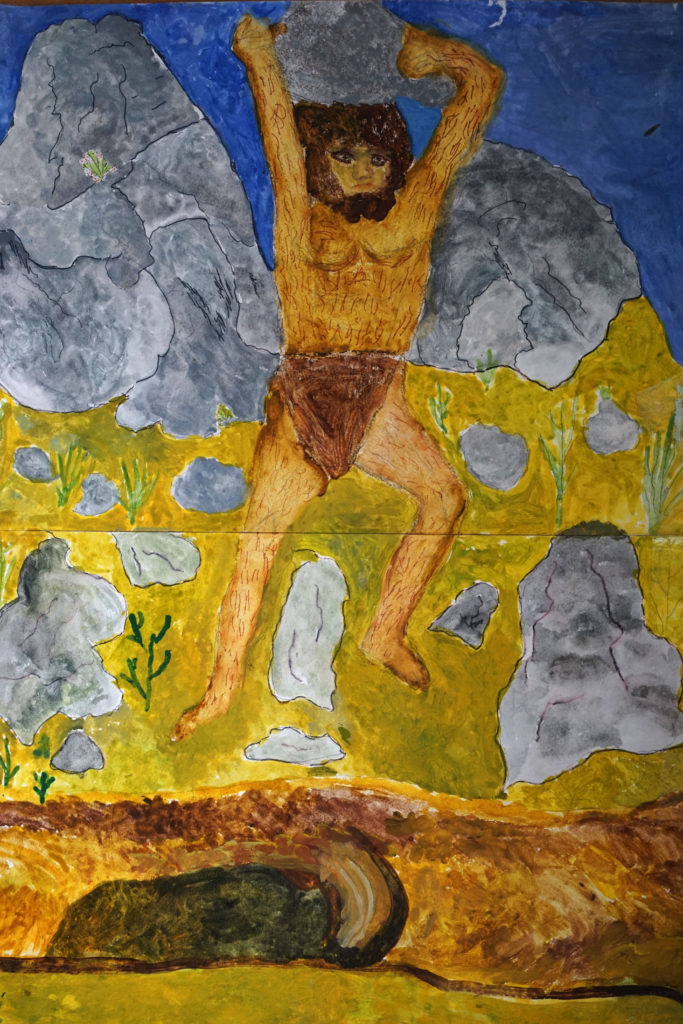 Пенсионерка рисует в основном природу. Хотя на одной из картин — большой волосатый мужчина. «Это дикарь. Небритый мужчина. Нам рассказывали про древность, ну, я и нарисовала, как он на мамонта-то охотится», — объясняет художница. «Небритый мужчина» тоже отправляется на выставку в Москву.
