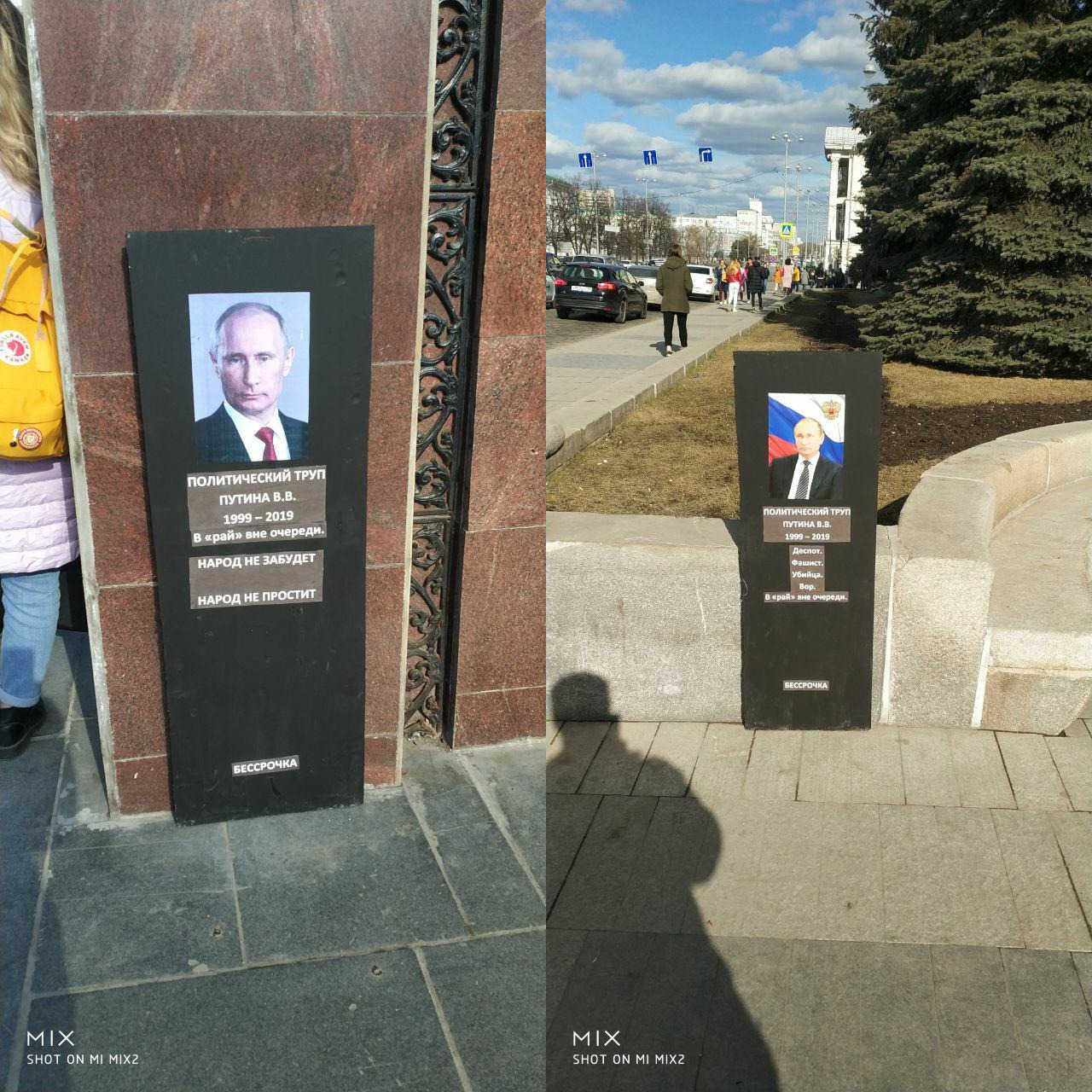 21 апреля активисты «бессрочного протеста» установили «надгробия» Путина в центре города – у мэрии и у входа на станцию метро «Площадь 1905 года». До этого аналогичные акции проходили в Петербурге и Набережных Челнах.