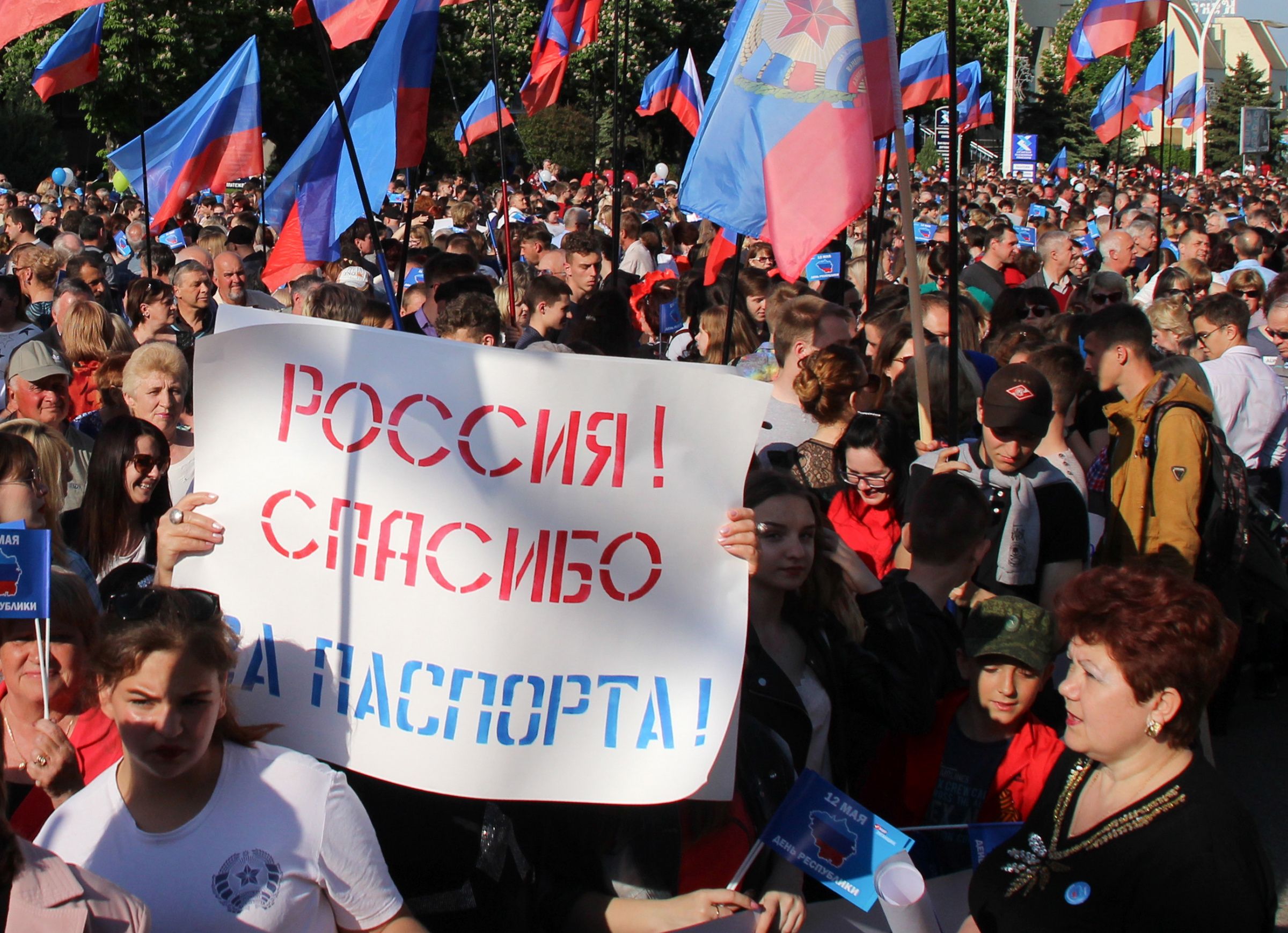 Александр Река / ТАСС / Scanpix / LETA Участники шествия «С Россией в сердце» в день пятилетия образования ЛНР. Луганск, 12 мая 2019 года