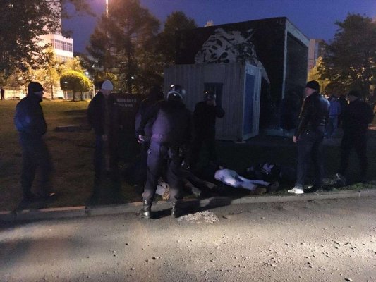 Во время народного схода задержанные прорвались за ограждение сквера, после чего полицейские, скручивая руки, повалили их на землю. Задержанных должны повезти в отдел полиции № 9 на улице Крылова.