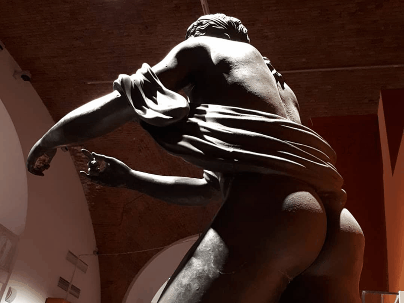 Для тех, кто когда-то пробегал мимо художественной школы или античного отдела большого музея, античность — это время и место, где спокойно-счастливые, в меру подкачанные люди танцуют и поют, радостно занимаются эстетически безупречным сексом (всегда по обоюдному желанию и не снимая полуулыбки), пьют вино на морском берегу, закусывают оливками, иногда указывают какому-нибудь варвару: знай свое место, фу, противный, ты и стихи-то не можешь сочинить, и атлет из тебя так себе, жирком заплыл. Для европейца она предстает мечтой гедониста: в античность ему хочется съездить в отпуск, завести там параллельную жизнь с бассейном, вином и любовником (и не одним), открыть санаторий для вечно стрессующих коллег. Помпейская экспозиция создает для этих мыслей свое чувственно-эмоциональное русло: ведь скульптуры так хочется трогать, и музейный запрет на прикосновение нигде не кажется таким бесчеловечным, как в античных залах. Гуляя по эрмитажной выставке, хочется пить тягучее, ленивое вино с итальянского юга, которое пахнет теплой глиной и мандариновой коркой, а в послевкусии выдает апельсиновую косточку. Терракотовые щиты и арка органично вписываются в голое краснокирпичное небо Манежа. Сюда бы мандариновые деревья для полного счастья, но и без них «Боги, люди, герои» — едва ли не самая душеполезная выставка в Петербурге за долгое время.