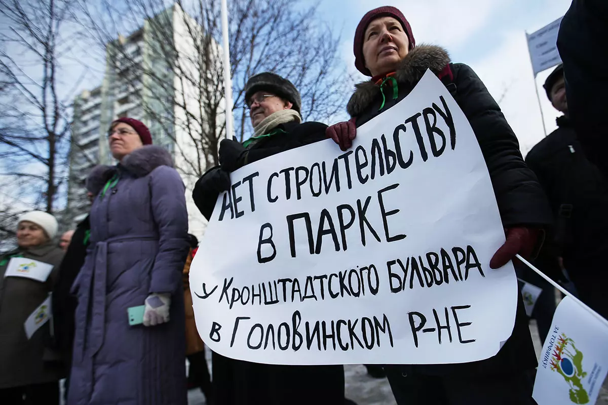 Участники митинга против строительства храма на территории парка «Торфянка» в Лосиноостровском районе. Фото: Антон Новодережкин / ТАСС