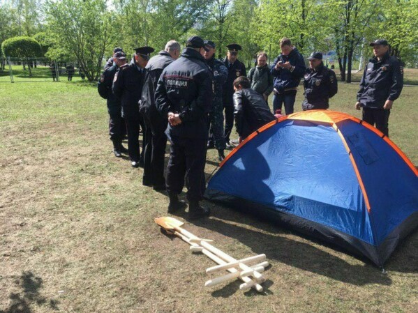 Двое мужчин установили в сквере в Екатеринбурге, где 14 мая прошла протестная акция против строительства храма, палатку и остались в ней ночевать. Утром 15 мая к ним постучались сотрудники полиции, об этом сообщил Znak.