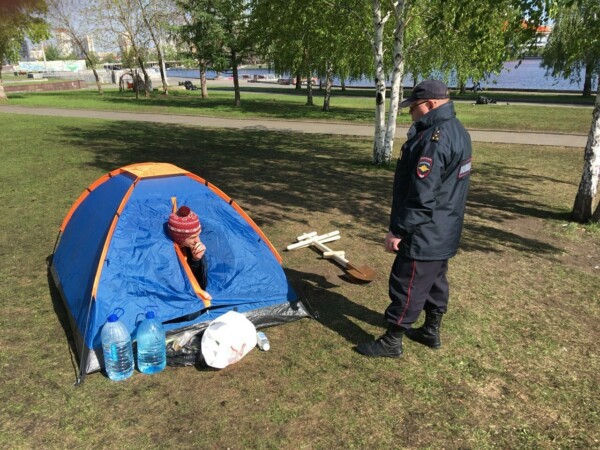 Двое мужчин остались ночевать в сквере Екатеринбурга в палатке. Чиновник назвал это незаконным пикетом