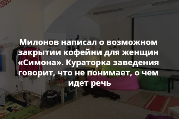 Днем 16 мая депутат Госдумы Виталий Милонов сообщил в своем фейсбуке о возможном закрытии петербургской кофейни-коворкинга для женщин «Симона». Однако в самом заведении говорят, что не понимают, о чем идет речь.