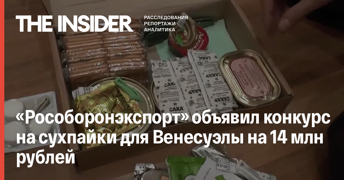 «Рособоронэкспорт» проводит аукцион на поставку сухпайков в Венесуэлу. Стоимость госконтракта — 14,3 млн рублей. Всего нужно поставить 16,5 тысячи пайков, стоимость одного — около 87о рублей.