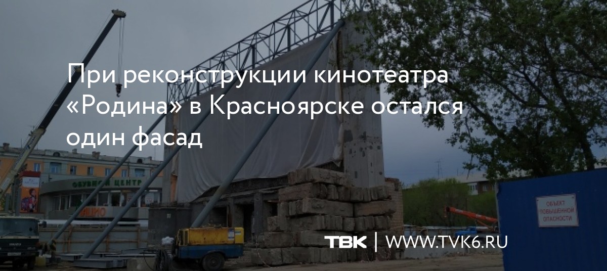 При реконструкции красноярского кинотеатра «Родина» в Красноярске от здания остался один фасад. На стене сохранят мозаичное панно «Родина-мать».