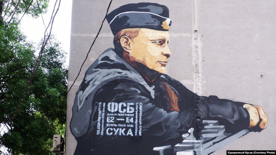 В Симферополе утром 21 мая на фасаде дома №11 по улице Александра Невского, где находится мурал с изображением российского президента Владимира Путина, появилось граффити с «посланием» к ФСБ России. Об этом написал Телеграм-канал «Суверенный Крым», который и взял на себя ответственность за акцию.