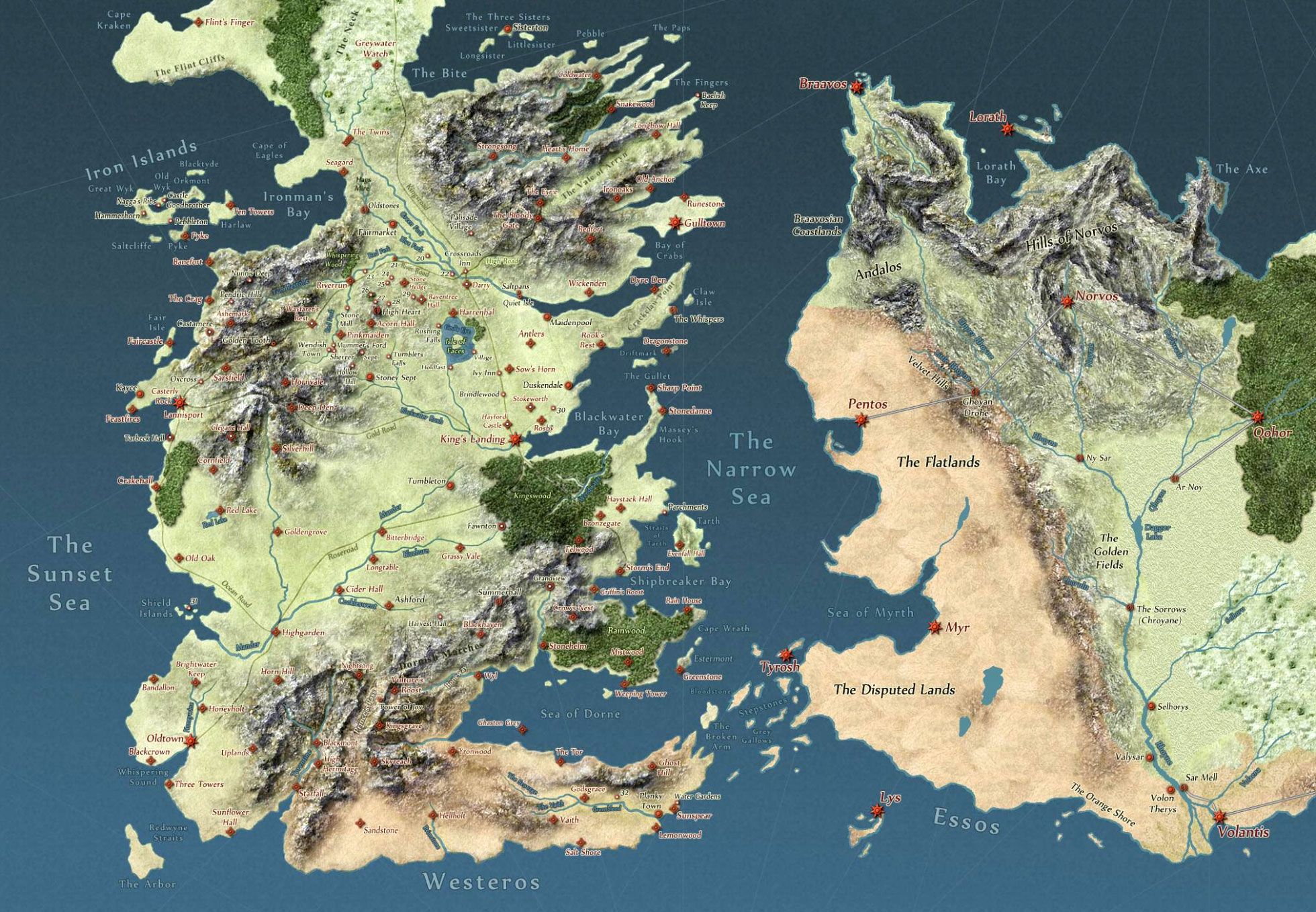 В Вестеросе шесть территорий, которыми управляют знатные феодалы: Штормовые земли (правители — Баратеоны), Простор (сейчас отошел Бронну), Речные земли (Талли), Север (Старки), Долина (Аррены) и Утес Кастерли (Ланнистеры). Плюс Королевские земли и автономные Дорн (Мартеллы) и Железные острова (Грейджои).