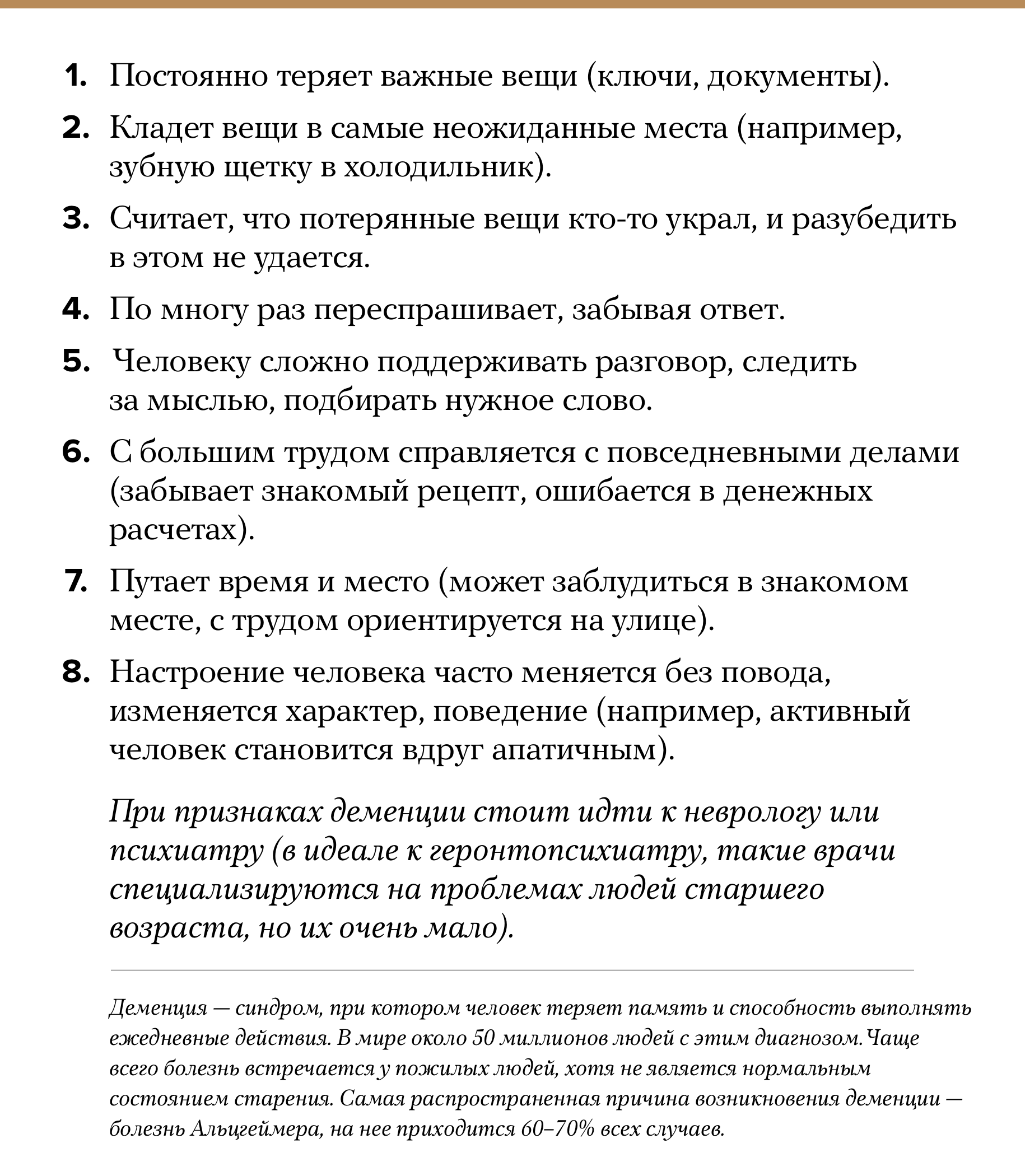 Дата23.05.2019АвторСкрытИсточникМедузаСохранённая копияInternet ArchiveOriginal MaterialShow translationВозможно, у вашего близкого деменция — а вы даже не подозреваетеВот 8 признаков Источники: британская Национальная служба здравоохранения, UpToDate.com, книга «Жизнь рядом. Чем помочь близким с деменцией и как помочь себе». За дополнительной информацией можно обращаться в некоммерческую организацию «Помощь пациентам с болезнью Альцгеймера и их семьям». Другие материалы проекта MeduzaCare читайте тут. Фото в анонсе: andreiuc88 / Shutterstock.com