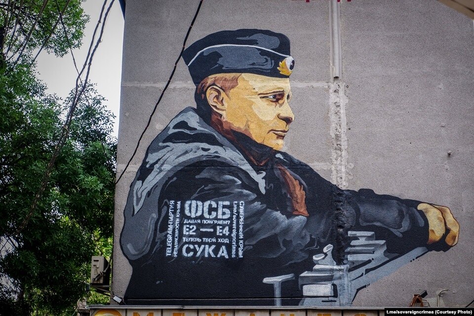 Утром 21 мая спешившие на работу жители Симферополя обнаружили, что дом №11 на улице Александра Невского, где расположены офисы нескольких организаций и фирм, окружен полицейскими и людьми в штатском. Силовики искали не бомбу, не грабителей и не убийц: они пытались задержать по горячим следам авторов граффити, которое появилось ночью на стене дома поверх мурала с изображением Владимира Путина. Надпись, сделанная с помощью трафарета, была адресована ФСБ: "Давай поиграем? Е2-Е4. Теперь твой ход, сука". Авторство послания к российской спецслужбе взяли на себя активисты ранее неизвестной "Telegram-партии" под названием "Суверенный Крым", которые утверждают, что разочаровались в российской власти после аннексии полуострова и хотят видеть его республикой, независимой как от Украины, так и от России.