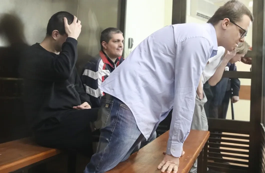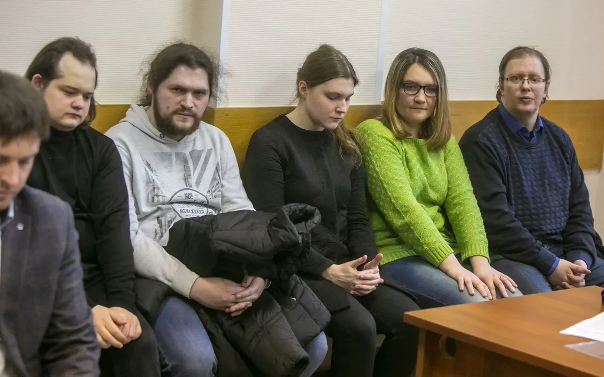 В первых рядах на скамейках для слушателей в зале разместились обвиняемые Анна Павликова, Мария Дубовик, Максим Рощин и Сергей Гаврилов. Они находятся под домашним арестом. Некоторым адвокатам не хватило места за столом, им пришлось также сесть на скамейки для слушателей. Родные заняли последние ряды. И даже в таком составе им было тесно в зале. Затем в «аквариум» завели Руслана Костыленкова, Дмитрия Полетаева, Петра Карамзина и Вячеслава Крюкова. Все они содержатся под стражей.