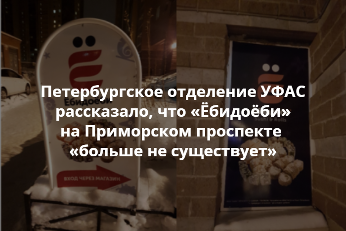 Петербургское отделение УФАС опубликовало информацию о том, что суши-бар «Ёбидоёби», на название которого жаловались петербуржцы, закрыли. Ведомство сообщило, что директор заведения продала бизнес из-за «аморального названия».