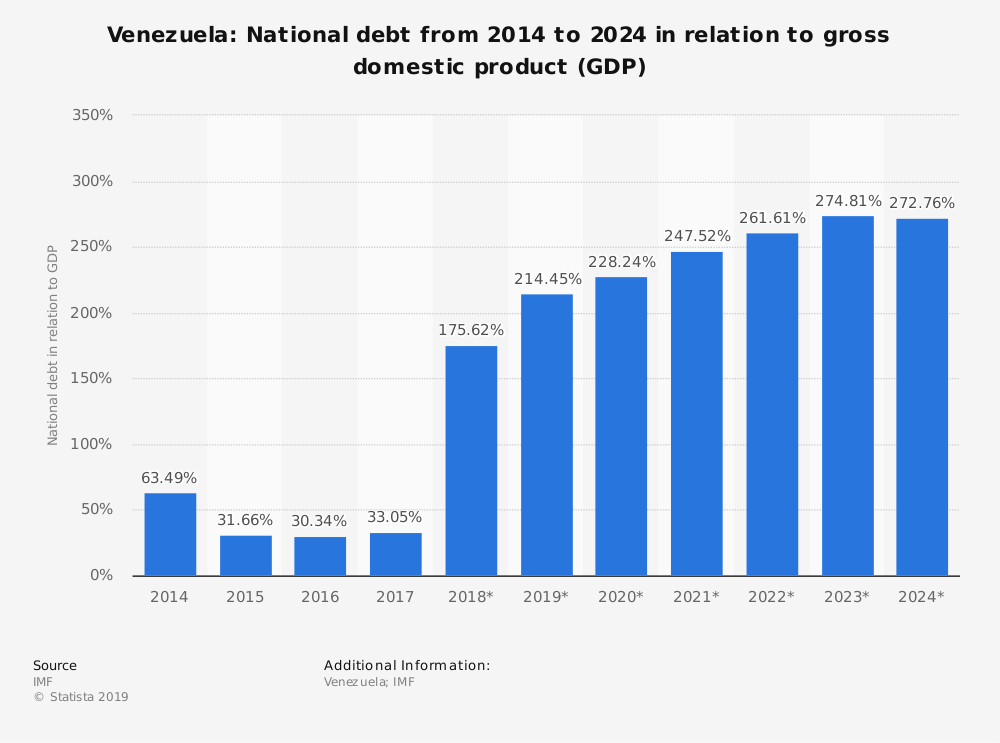 Точный размер долга Венесуэлы не известен, ЦБ его не раскрыл. Президент Николас Мадуро еще год назад объявлял о планах рефинансировать около $100 млрд долгов. По расчетам МВФ, соотношение госдолга Венесуэлы к ее ВВП должно приближаться или уже быть больше 200%.