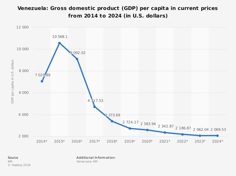 Инфляция в Венесуэле выросла со 180% в 2015 году до 130 000% за 9 месяцев 2018 года. У оппозиционного конгресса другие подсчеты — 1 700 000% за весь прошлый год. Сейчас это самая высокая инфляция в мире.
