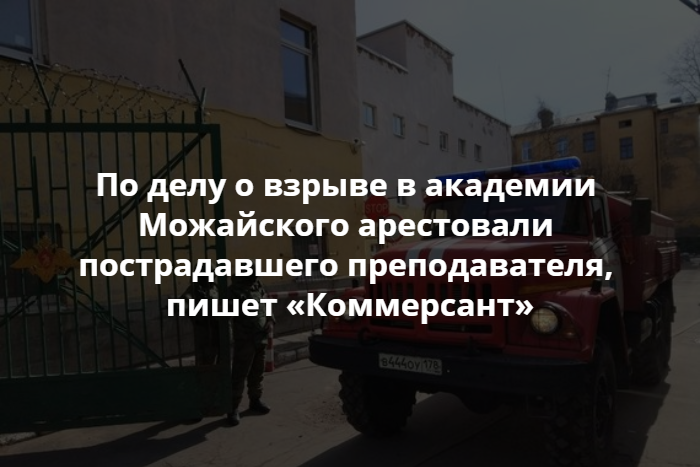 По делу о взрыве в Военно-космической академии имени Можайского в Петербурге обвинили преподавателя, бывшего сапера Рифата Закирова, который пострадал в результате происшествия. Об этом пишет «Коммерсант» со ссылкой на источник, близкий к военным следователям, ведущим расследование. Официального подтверждения этой информации нет.