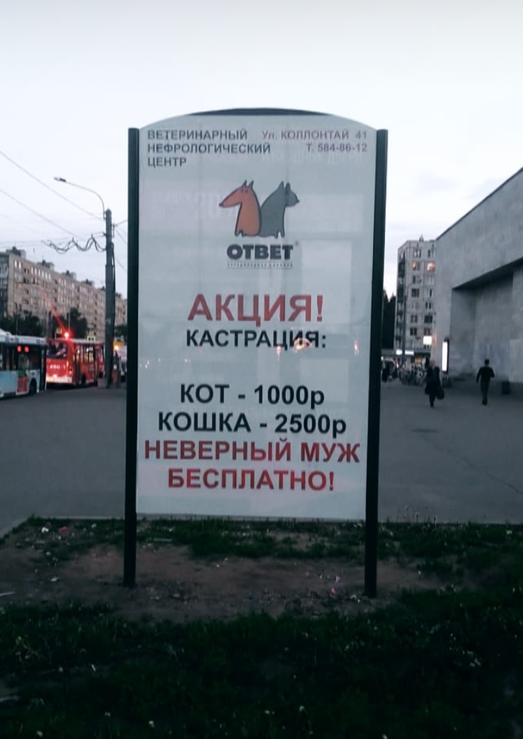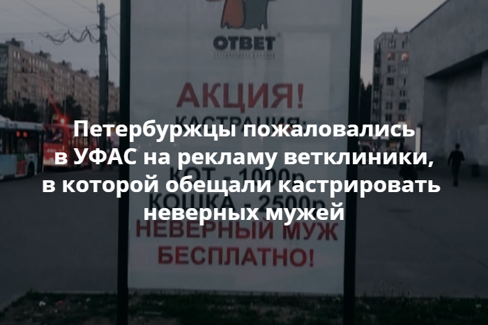 На рекламном плакате сообщались цены на кастрацию кота и кошки, а услугу по кастрации неверного мужа обещали предоставить бесплатно. Петербуржцы, которые отправили жалобу, посчитали рекламу оскорбительной.