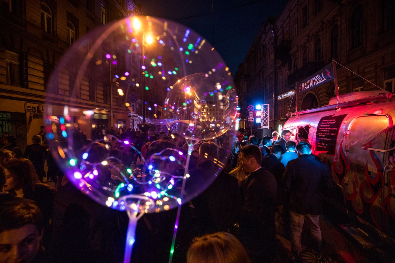 Из пяти тысяч участников юридического форума в 2019-м на вечеринку пришли порядка 300 юристов. Они гуляли по заведениям, выпивали на проезжей части (машинам доступ в тот день был тоже закрыт) и делали селфи на фоне выступавших там Леонида Агутина, Максима Леонидова и Гоши Куценко. В толпе веселых гостей были и местные жители: несколько человек стояли в одиночных пикетах и держали плакаты с надписями «Help people».