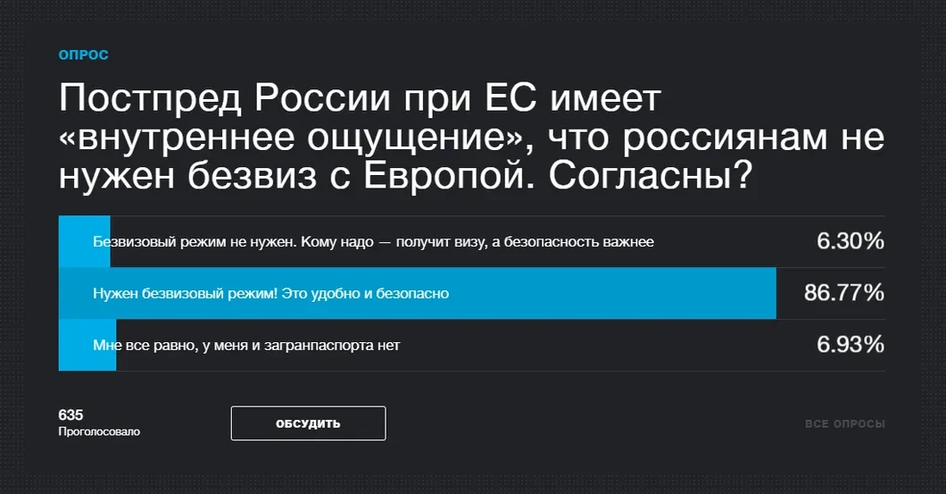 Он отметил, что подавляющее большинство вопросов к нему в этом интервью касалось виз. Видимо, это тема тогда волновала граждан России. Изменилось ли что сейчас? Вот недавняя цитата того же дипломата.