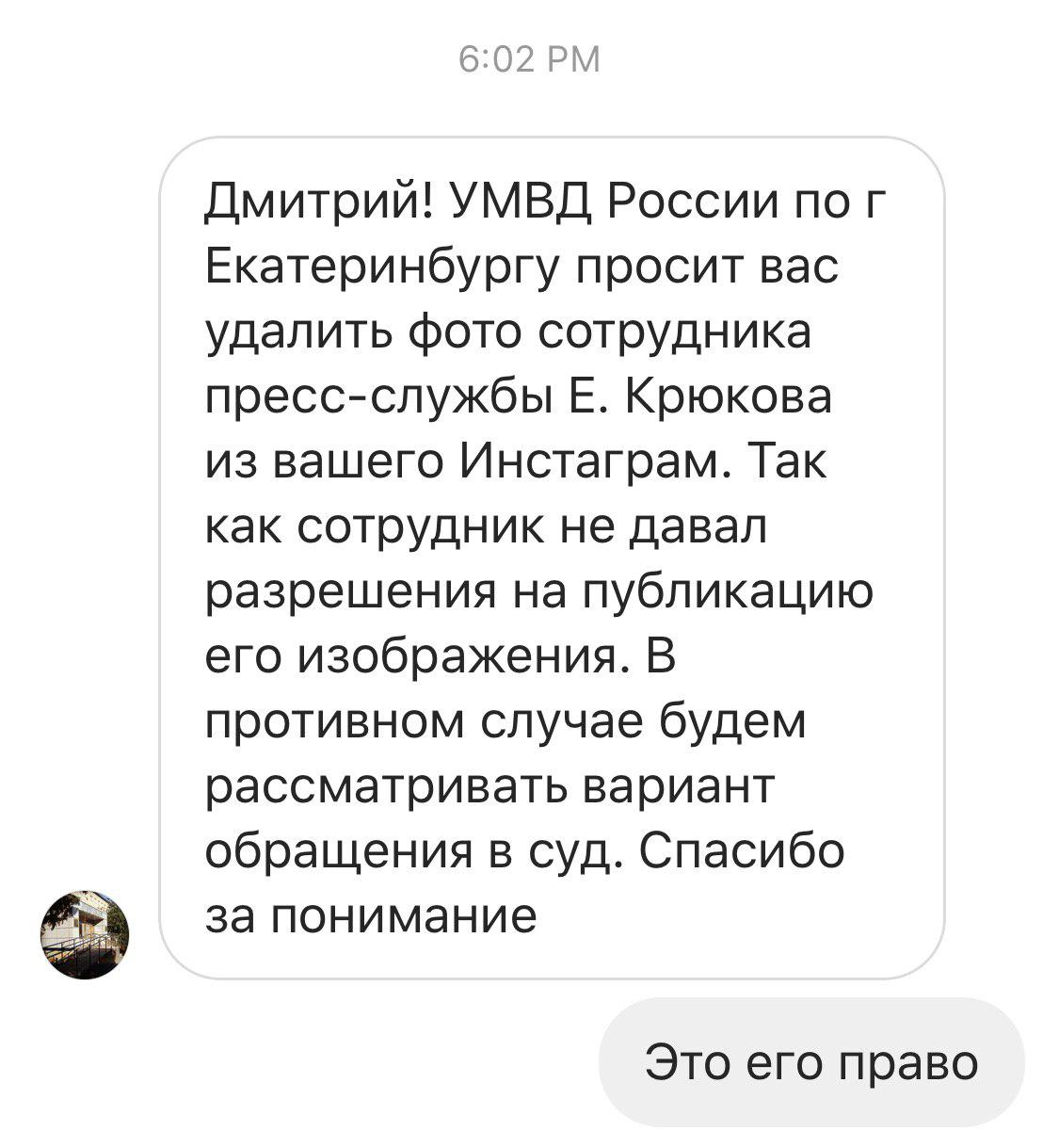 В разговоре с «МБХ медиа» Колезев уточнил, что ему позвонил человек, представившийся пострадавшим майором Евгением Крюковым, и попросил удалить фотографию или «закрыть лицо». Шеф-редактор также уточнил, что ему написали с аккаунта uvdekb. В описании к этому профилю говорится, что аккаунт принадлежит УМВД России по Екатеринбургу.