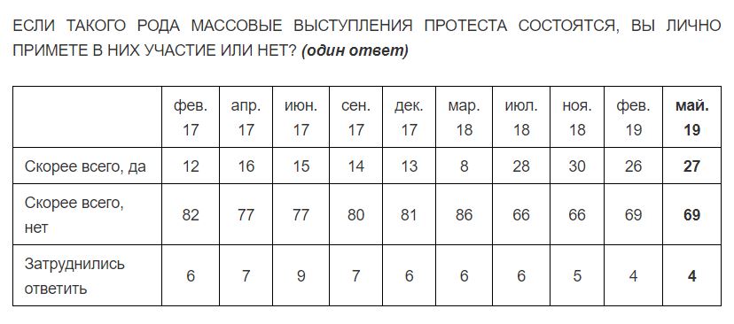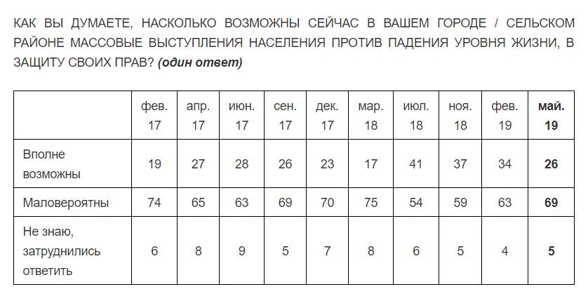 63% россиян считают, что за последнее время число недовольных властью выросло, следует из опроса «Левада-центра». Число недовольных, подтвердивших социологам свою готовность принять участие в акциях протеста (27%), почти не изменилось, а доля людей, которые верят в возможность таких акций в их родных местах, снизилась — с 41% в июле 2018 года до 26% в мае 2019 года. Но эта цифра может в любой момент вырасти, допускают социологи: майские протестные акции показали, что превращение недовольства в публичный акт может быть действенно.
