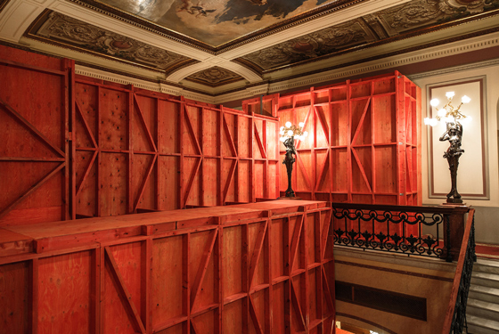 Да, Воронов и Шишкин-Хокусай обращаются к эстетике, которая у петербуржцев ассоциируется с БДТ, наверное, в последнюю очередь, — но чего они точно не хотели, так это заглушить архитектуру старого театра. Наоборот, когда вы смотрите на их работу снаружи, грубая изнанка конструкции подчеркивает богатство расписных потолков и лепных карнизов. А когда попадаете внутрь — видите детали исторического интерьера словно через объектив фотографа, намеренного показать вам знакомое место с непривычного ракурса.