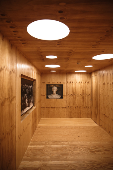 Он обладает первичными признаками театра — начинается с вешалки, продолжается чем-то вроде фойе, а заканчивается камерным залом на 23 места и крошечными подмостками — и противоположен «основной личности» во всем остальном. Вместо золота и мрамора — фанера. Вместо статуй, ковров и лепнины — чистая геометрия. Вместо широких парадных лестниц — тесные проходы.