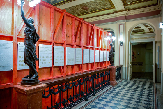 «Фанерный театр» — это памятник эпохе, когда советский театр еще мог себе позволить быть авангардным. Красный и черный — эта цвета конструктивистов, дешевый материал отсылает к идеологии пролетарского искусства, а выпирающий из ложи «нос Буратино» — к супрематическому плакату Эля Лисицкого. Внешнюю стену, которая смотрит на галерею, украшают мемориальные доски художников, работавших в БДТ в разные годы: среди них есть авангардисты первой величины — например, Кузьма Петров-Водкин и Натан Альтман.