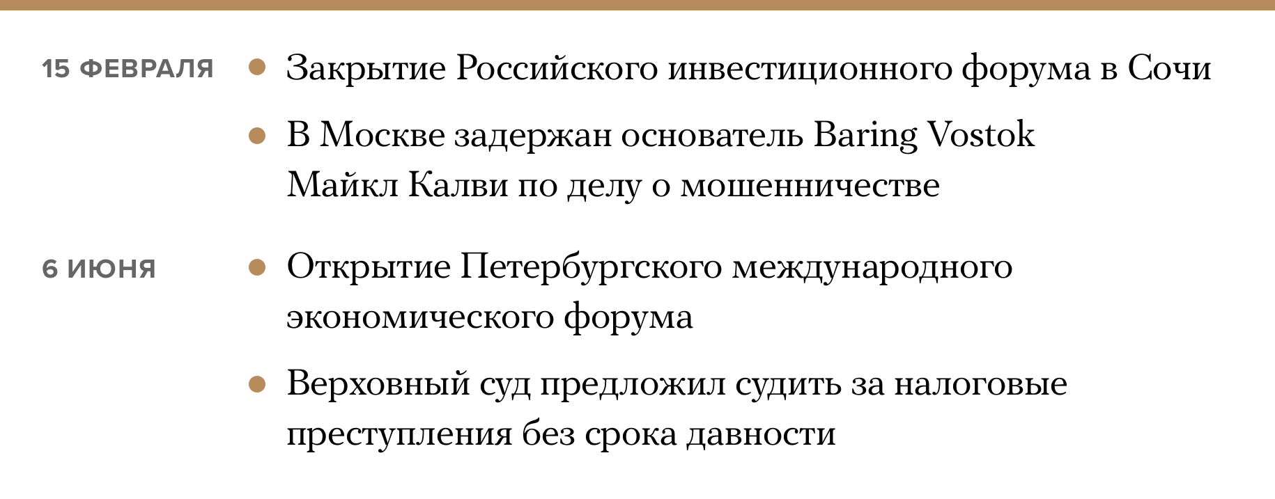 6 июня открылся Петербургский международный экономический форум, в приветственном слове к которому президент Владимир Путин сказал, что для решения современных задач «нужна сильная и эффективная экономика, честные и прозрачные правила глобальной торговли, свободный обмен инвестициями и технологиями, здоровая и честная конкуренция». Одновременно прошло заседание Пленума Верховного суда, на котором было предложено не применять срок давности к налоговым преступлениям — их будут считать длящимися до тех пор, пока не погашена недоимка.