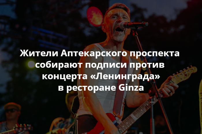 Жители Аптекарского проспекта собрали 28 подписей под обращением к врио губернатора Александру Беглову с просьбой помешать проведению концерта «Ленинграда» в ресторане Ginza в ночное время. Об этом «Бумаге» рассказали сами местные жители.