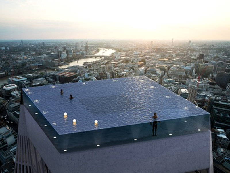 Проект под названием Infinity London его создатели называют первым в своем роде зданием с бассейном на крыше, обеспечивающим 360-градусный обзор. Специальная система будет следить за ветром и предотвращать выплескивание воды через край бассейна, а для подогрева воды в нем планируется использовать тепло от системы кондиционирования воздуха в здании. В ночное время бассейн будет освещен подсветкой, а на нескольких этажах под ним разместится пятизвездочный отель. Начать строительство планируется в 2020 году, но точное место возведения небоскреба пока не определено.